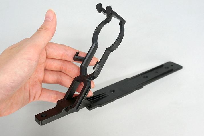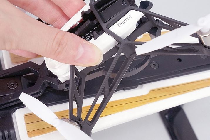 ミニドローンは、前方から、サポートの取っ掛かりにミニドローンのフレームを引っ掛けるようにして装着します