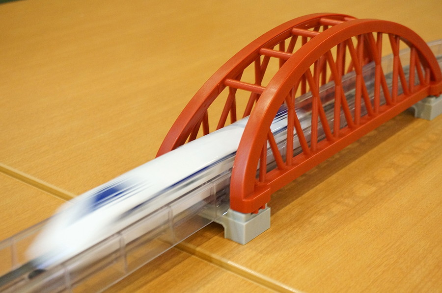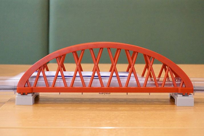 赤い橋は、日本で初めてニールセンローゼ橋という設計を採用したという、山梨リニア実験線にかかる小形山架道橋をモデルにしているそう。ニールセンローゼ橋というのはアーチ橋の一種のことです