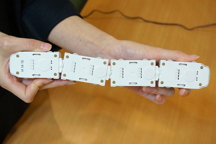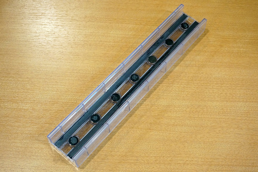 レールの一部分。両脇の直線になっている磁石で車両を浮かせています。真ん中に等間隔に配置されている丸いのも磁石