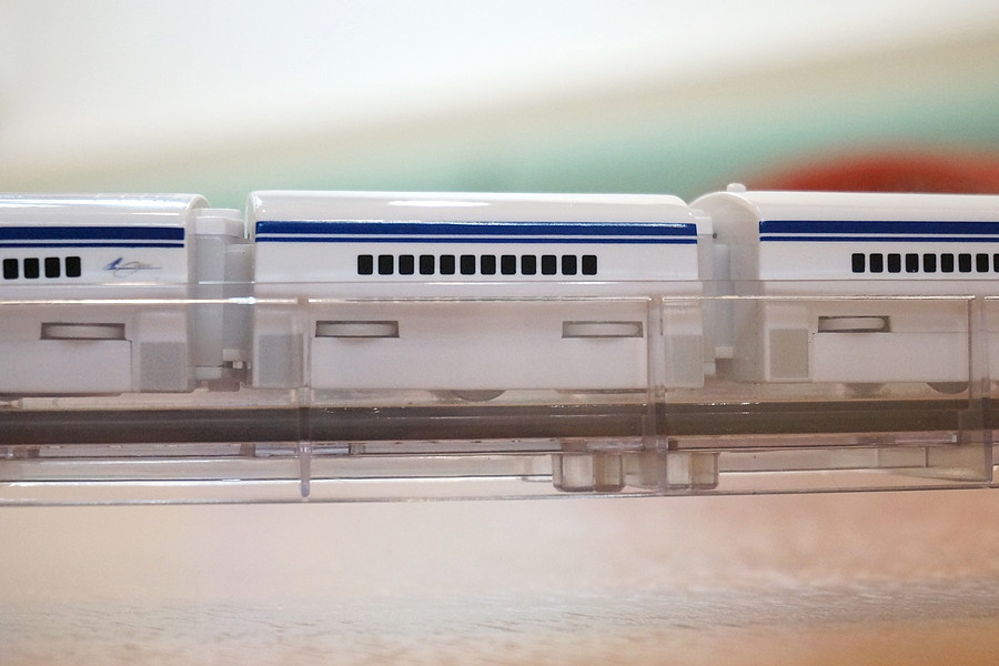 JR東海が開発中の「超電導リニア L0系」の実用化よりもはやく、おもちゃのリニアが登場しました! タカラトミーが発売した「リニアライナー 超電導リニア L0系」(以下、リニアライナー)です。スペシャルセットの価格は37,800円(税込)。磁石のN極とN極、S極とS極が近づくときに起こる、磁力の反発の力で、車両が浮かびながら滑るようにレールの上を走る、世界で初めての「リニア・レールトイ」です。なんと、スケールスピードは時速500kmを突破します! リニアライナーは、本物の超電導リニアと比較すると約1/90のサイズになっているそうですが、それでもとっても速い!