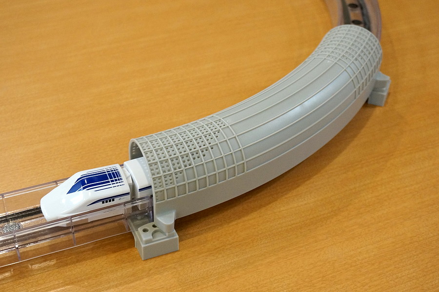 トンネルは、山梨実験線のトンネル緩衝工がモデルで、微気圧波軽減用の多孔板をデザインしているそうですよ