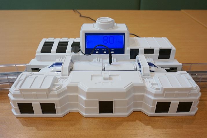 次に、コントロールステーションの「MODE」ボタンを押し、モニターに「%」が表示される「充電モード」にします。車両の3両目にあるメインスイッチをオフにして(オフにすると、オン時には車両の先頭で白色に光っていたLEDが消灯します。また、車両がオフになってないと充電は開始されません)、コントロールステーションから充電ケーブルを引き出して、充電プラグを車両の充電プラグ差込口に差し込みます。