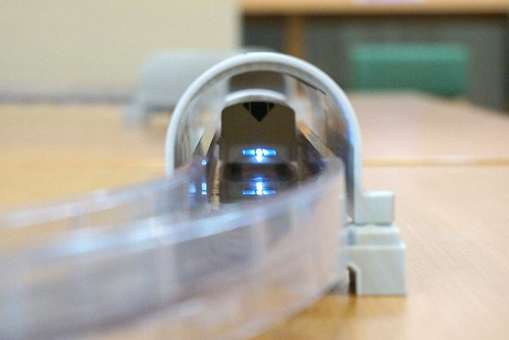 レールの直線状の磁石と、車両の外側の磁石の磁極の向きは、反発しあうように取り付けられているため、磁石の反発力で車両は約2mmほどレールから浮きます。車両のスイッチをオフにしてレールに乗せると、車両はどちらにも進まずに、その場で約2mm浮いた状態で停まっています