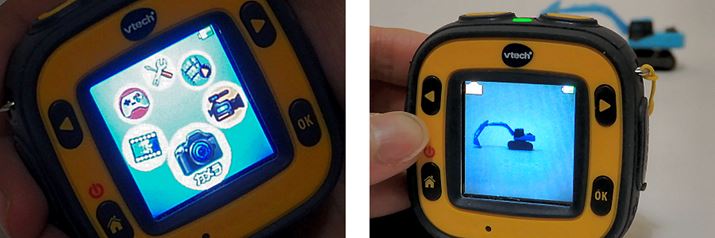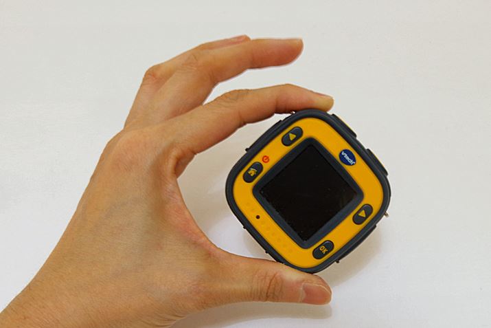 まず、プレイショットの概要を紹介しましょう。プレイショットには、大人向けのアクションカメラにあるようなWi-FiやBluetooth接続といった通信機能はいっさいありません。30万画素(640×480ドット)の撮像素子とレンズ、1.41インチのカラー液晶ディスプレーを備えた、約6cm四方、厚さ2cm程度の小さなカメラです。