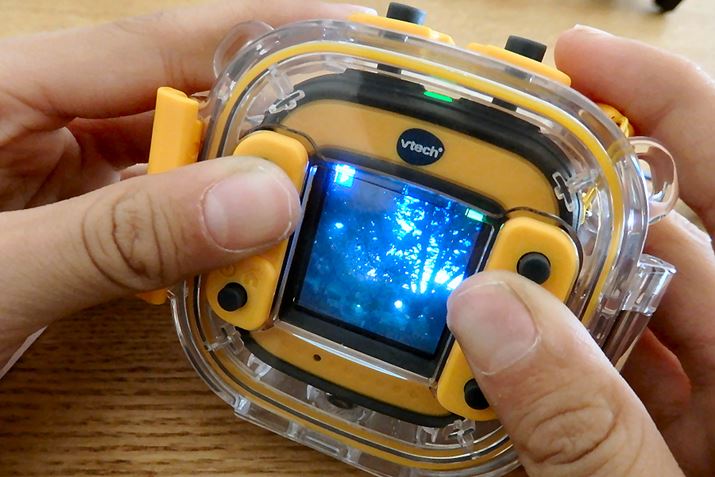 現代の小学生はゲーム機やスマホなどでデジカメ操作はお手のもの。さて、プレイショットをどう違う? 写真は付属の防水ケースに入れた状態