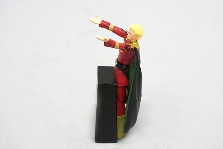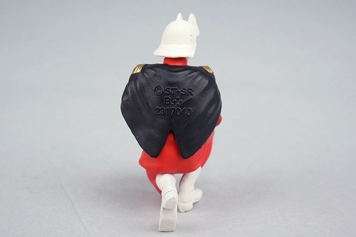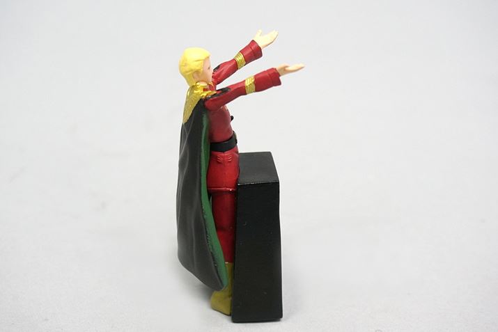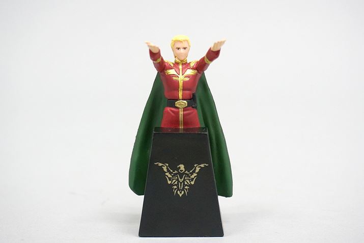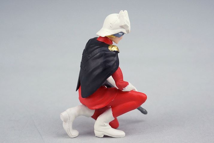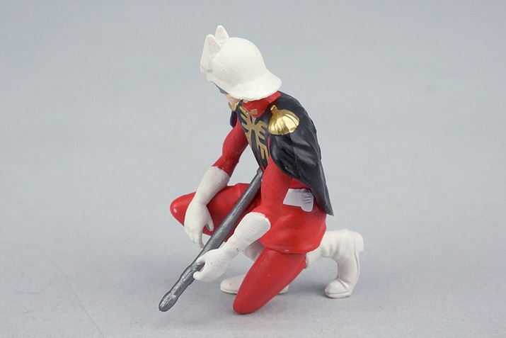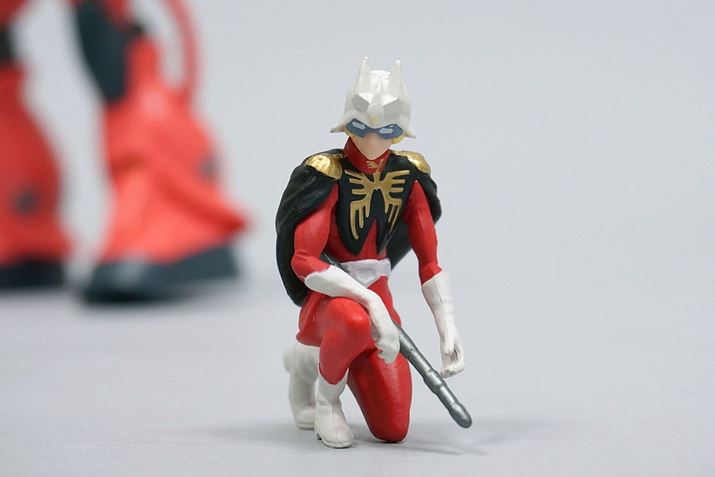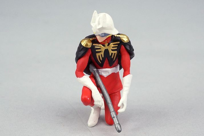 「逆襲のシャア」より、ネオ・ジオンの総帥となって演説しているシーンのシャアさん。掲げた両手に小物を持たせることができます。ちょうどよいものが見つからないのでとりあえずクリップを2種お持ちいただきました。これでは道化なのでは?! でも、総帥は5体の中でもひときわ お役立ち力が高い!!