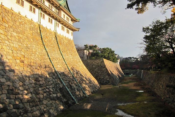 前回紹介した浜松城の石垣は自然の石をそのまま組み上げる「野面積み」だったが、それと名古屋城の天守台を比較していただきたい。精巧さの違いが一目瞭然だ。名古屋城のほうは石を積みやすい形に成形し、隙間には間詰め石を入れて表面を平らに整える打込接(うちこみはぎ)で造られている。石と石の間に隙間ができないため、足もかけづらく侵入がしにくい。さらに武者返しの設計により、登ったとしても侵入者はバランスを崩して落ちてしまう。この石垣を越えるのはかなりの至難。前述で、名古屋城は鉄壁の城と伝えたが、それは伊達ではないようだ。最大20m、総延長8.2kmにもおよぶ天守台の石垣を作り上げた加藤清正は、まさに名古屋城のヒーロー。