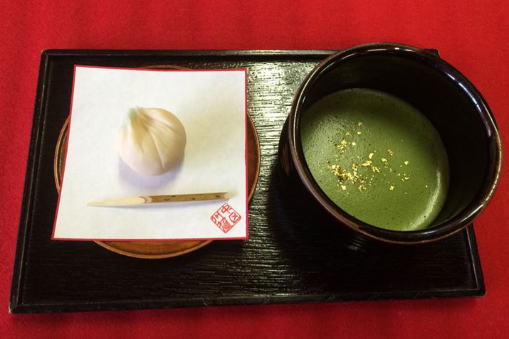 通常の抹茶セット(550円)にプラス100円で、金粉入り抹茶(650円)がいただける。居城跡が近いことにかけて、筆者は信長に入れてもらったお茶だと想像しながら飲んでいたのだが、涙が出るほど感動した