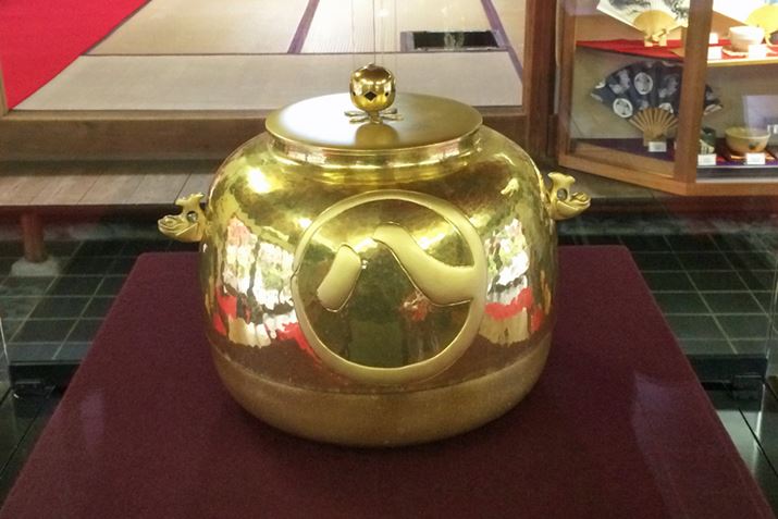 空襲で焼け落ちた金のシャチホコを溶かして作った「金の茶釜」のレプリカが展示されているのだが、毎週金曜日には、この茶釜で淹れたお茶がいただける。ちなみに、本物の茶釜は天守閣の中に展示されているという(不定期で入れ替えられるため、展示されていないこともある)