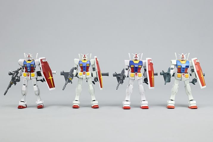 左から、RG 01 RX-78-2 ガンダム、HGUC 191 RX-78-2ガンダム(新モデル)、HGUC 021 RX-78-2 ガンダム(旧モデル)、HGガンプラスターターセットのガンダム(アニメカラー仕様)です。旧HGガンダムに比べて、色が大幅に変化しています。100%ホワイトだった部分が、少しグレーやグリーンのような色味の合わさったようになりました。スターターセットの「アニメカラー仕様」に近いですね。体のスマートさはRGにも近いですが、新HGガンダムのウエストがキュッとなっているのが印象的です。あと、4体の中でいちばん小顔ですね