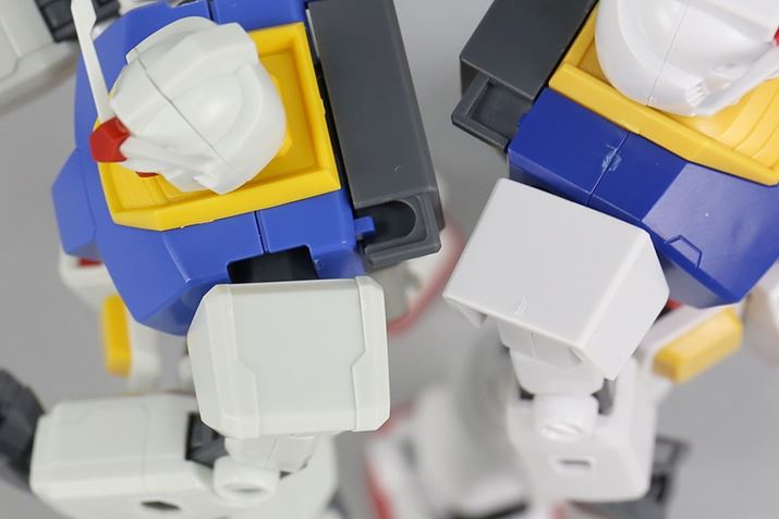 左が新モデル、右が旧モデル。肩カバーを見ると、旧モデルは1パーツで表現されており、真ん中に薄く線(段差)が入ってしまっていました。いっぽうの新モデルの肩は、前後2つのパーツで表現。合わせ目と筋彫りが肩の前後に同じようなラインを表現していて、不自然さがありません。あと、ビームサーベルを差し込むところも丸く深くなっていて、ビームサーベルの持ち手の部分が落ちにくくなっていてうれしいです! 肩に当たる胴の部分も新モデルは凹型に成形されており、可動域が広いことがわかりますね