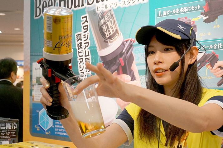 スポーツ観戦に球場などスタジアムへ行くと、ビールサーバーを背負ったお姉さんが、冷えたビールを勢いよく注いでくれますよね! あの感じ!を再現したそうで、注ぐときの勢いがジェットです。本体はビール(液体)を注ぐところと、泡を注ぐところに分かれていて、それぞれのトリガーを引くと勢いよくコップに噴出します。しかも、電池が要らない! 画期的! ジェット注ぎはインパクトがあって盛り上がりそうでした。トリガーを引くだけの簡単さも魅力ですね。
