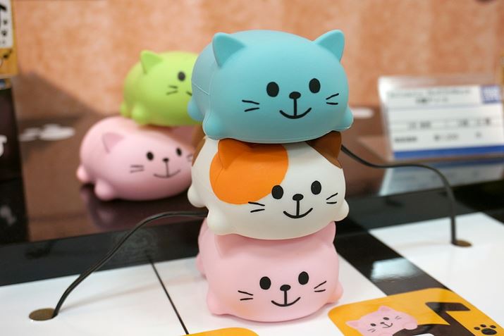 マシュマロみたいなむにゅむにゅしたさわりごこちの「ドレミファキャット」。押すと、1匹ずつ異なる音階の音が鳴るので、たくさん集めてピアノのように鳴らして演奏できます。押した長さ分、ニャー♪ と鳴き(鳴り?)ます。本体には1曲ずつ動揺などの有名な曲が内蔵されているので、1体からでも遊べます。