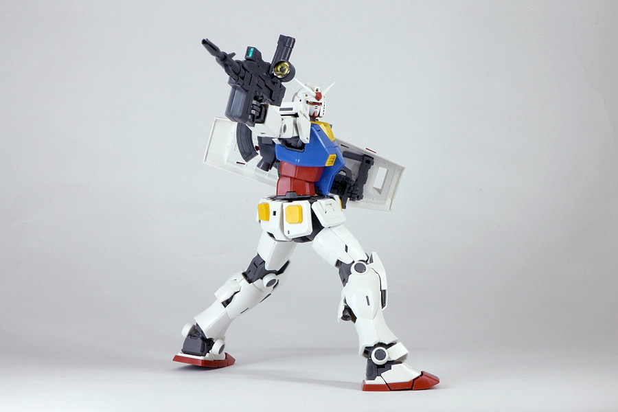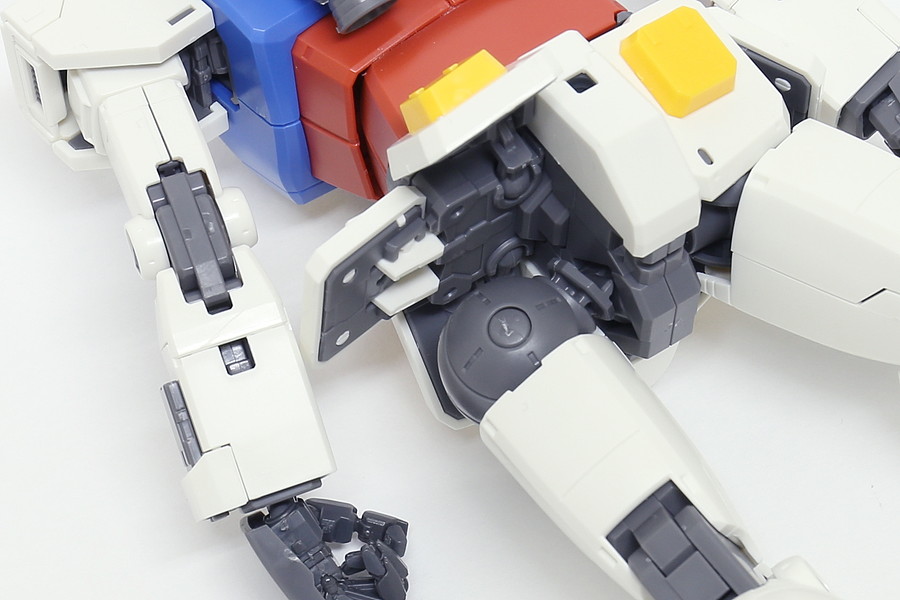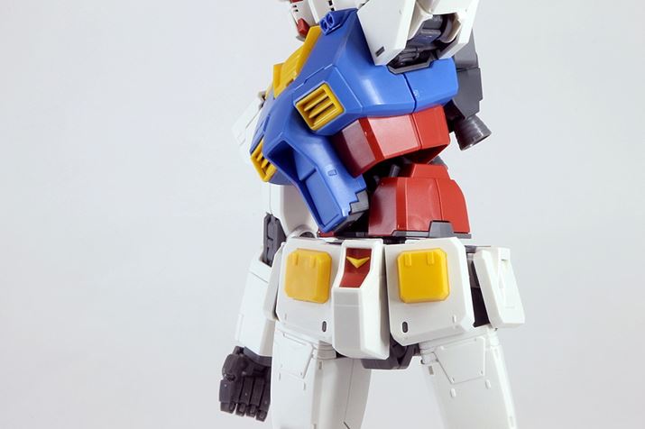 今回のTHE ORIGIN版ガンダムのすごいところは、その可動域の広さ。中でも、腰の可動は今回のガンダム一番のポイントではないでしょうか? 従来のガンダムのバリエーションと異なり、今回の版ガンダムには、腰パーツの内部にコア・ファイターが格納されていません。そのため、腰をひねる動作が可能になり、多様なポーズを取らせることができます。