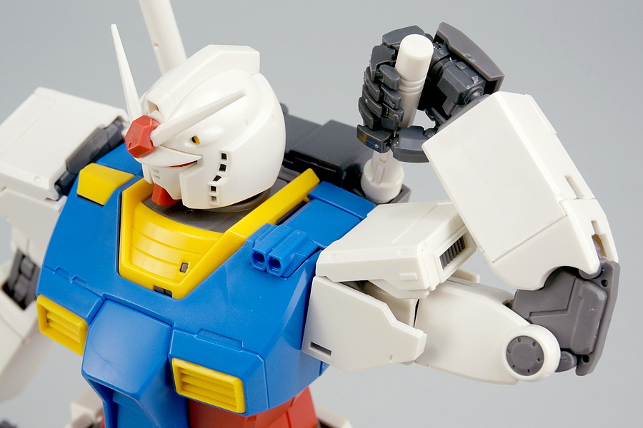 THE ORIGIN版ガンダムは、胸部の武器やコックピットハッチ、足の可動など、本体の細部にもいろいろなギミックが用意されています。組み立てたあとに、様々なポージングやシチュエーションを楽しめそうです。