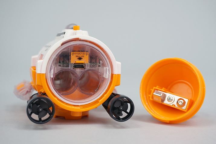 サブマリナーカメラの大きさは78(幅)×112(奥行き)×65(高さ)mmで、女性の握りこぶし程度の大きさです。重さは約90g。赤外線操作の可能距離は5mです。本体には、単3形アルカリ乾電池を2本使用し、連続で約40分間の操縦を楽しむことができます。コントローラーには、単3形アルカリ乾電池または単3形充電式電池を4本使用します(本体、コントローラーのいずれも、電池は別売りです)。
