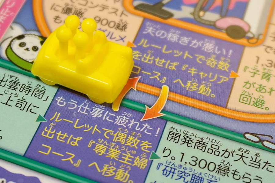 続いて、2ndステージへ。1stステージでの出雲旅行中に出会った男性たちの中から1人だけを選び、コマを進めます。本当にこのカレでいいのか? 相性は大丈夫? 結婚がゴールかと思いきや、結婚後もご近所づきあいや子どもの反抗期、夫の稼ぎが悪いなど、いろいろな問題に出会います。子育てや家事に専念する「専業主婦コース」と、子育てしながら仕事も続ける「キャリアコース」を選べるのが今風ですね。