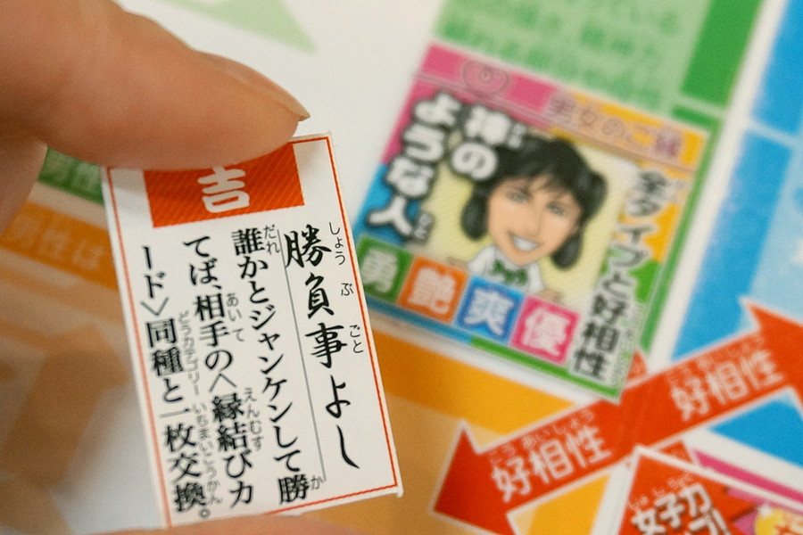 ベーシックな人生ゲームでは「だったらいいな」というような、夢のあるマスも多いですが、今回プレイした「出雲縁結びポケット人生ゲーム」では、“あるあるネタ”が多く、「うわーわかるわー」とうなずきながらプレイできました。たとえば、「気づけばメンズウォッチング」「予定をキャンセルして行った合コンがハズレ回」「彼氏より元カレを選ぶ?」「彼氏がマザコン!!」などなど。なかなかゲームの中でも夢を見させてくれませんが、そのいっぽうで、出雲らしく“神話ネタ”も盛り込んであるのが面白いです。イザナミとイザナギが出てきたり、因幡の白兎がプレイヤーのコマに同乗したり、ご縁カード「神のような人」のイラストがヤマトタケルのようだったり。「古事記で読んだことある!」というネタが面白く、出雲に行ってみたい気持ちが高まります。プレイヤーが出会うことになる男性たち(パートナー候補)も、「医者」や「商社マン」「スポーツ選手」といった人気の職業のほかに、「地酒の杜氏」「神主住職」「しじみ漁師」など、出雲ならではの職業が用意されていて新鮮でした。