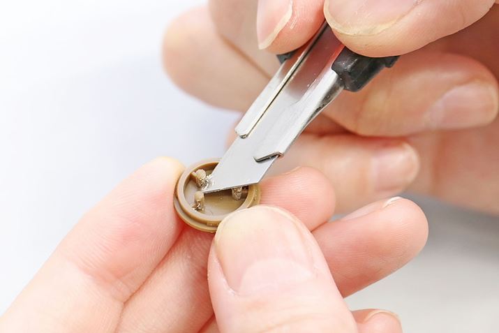 組み立ての際にパーツがうまくはまらないときは、ピンの部分を少し削ってあげるとよいでしょう。カッターなどを使って、ピンのまわりを薄く削ります