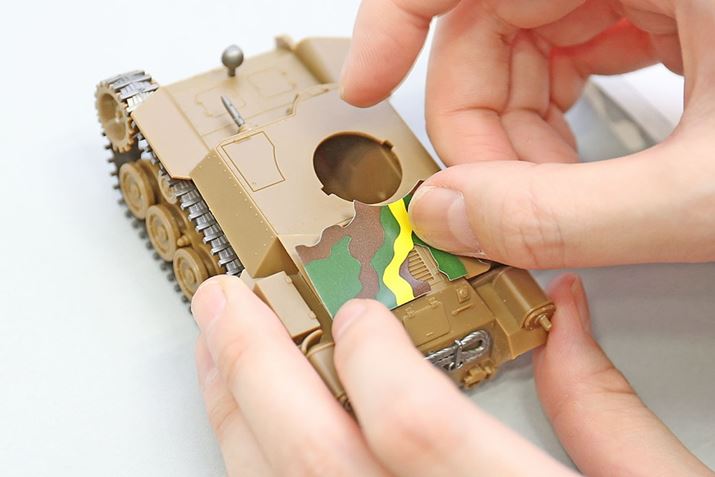 九七式中戦車の前期迷彩を再現できるリアルシールも付属しています。今回はシールを貼って迷彩模様を再現してみましょう。