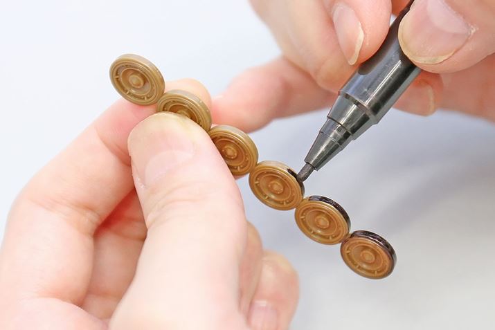 もっとこだわりたい人は、転輪の黒い部分の塗り分けを再現してみましょう。今回は、身近なアイテムの油性ペンで塗装します。