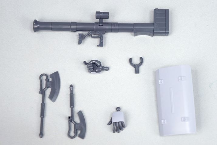 付属する武器は、上段「試作型MS用バズーカ」と「持ち手(右)」、バズーカ用の「腰部マウント」。下段左より、手に持たせる用と腰に装着する用2種類の「ヒートホーク」、「平手(左)」、「シールド」