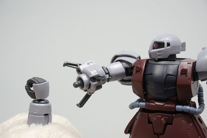 腕は一部を外して、THE ORIGINシリーズの「004 HG 1/144 プロトタイプグフ(戦術実証機)」や「006 HG 1/144 モビルワーカー MW-01 01式 後期型(マッシュ機)」の上腕部と付け替えることが可能となっています。パーツを付け替える際の爪の開閉ギミックがかっこいいです