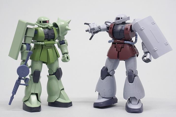 編集部に「スターターセット ガンダム vs. 量産型ザク」(2010年発売)のザクがいましたので並べてみました。背丈やからだの大きさは同じくらいですが、頭部はヴァッフのほうが少し小さめ