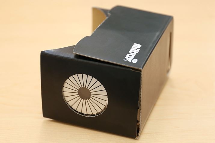 「MilboxTouch」はiPhoneなどのスマートフォンをセットして楽しむ、組み立て式のダンボール製2眼型VRゴーグルです。他のダンボール製VRゴーグルとの違いは、セットしたスマートフォンを操作するための、円形のタッチインターフェイスが本体の右側面に搭載されていること。本体の内部に指を入れて直接スマートフォンを操作する必要がなく、本体の外側をなぞることで、セットしたスマートフォンを操作できます。また、なぞり方を変えることで、セットしたスマートフォンにさまざまな操作をすることができます。円形のタッチインターフェイスを、くるくる丸くなぞると「スクロール」、スッと直線に払うようになぞると「スワイプ」、1か所をタッチすると「タップ」の入力ができます。どれも、1本の指で操作できます。