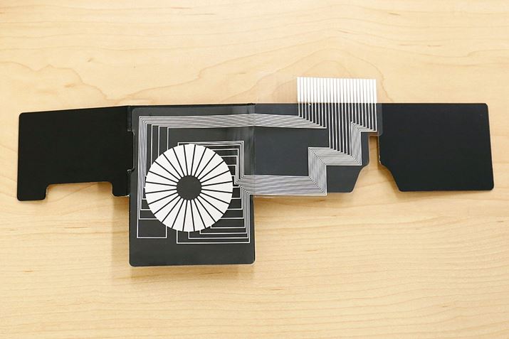 この円形のタッチインターフェイスには、「ExtensionSticker」という技術が使われています。「ExtensionSticker」とは、スマートフォンなどのタッチパネル画面に一部を触れさせておくだけで、外部からの指の動きをタッチパネル側へ伝えられる技術。一般的なスマートフォンやタブレットのタッチパネルは、タッチパネルに触れたときに指から伝わる静電容量の流れによって画面を操作していますが、「ExtensionSticker」は、導電性インクを使って、指から流れる静電容量をタッチパネルへ伝える仕組みになっています。