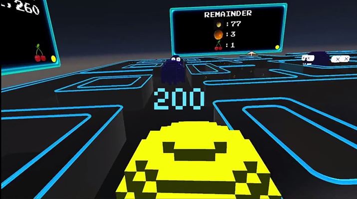 「MilboxTouch ver. VR PAC-MAN」のプレイ画面はこんな感じ。迷路の全体像がわかりにくくて、ゴーストから逃げるのがいつもより難しく感じました。「パックマン」自身も巨大ですが、ゴーストたちも巨大なので迫力があります
