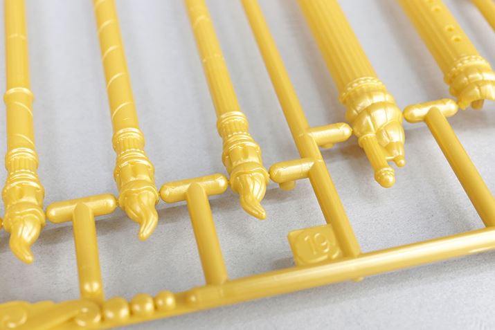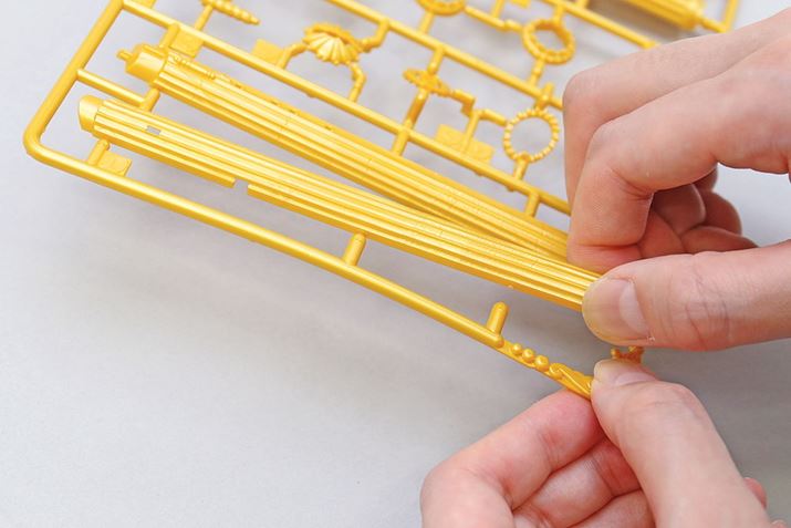 一般的なプラモデルでは、パーツの切り離しにニッパーが必要ですが、「キャッスルクラフトコレクション」は、パーツとゲートの接地面が少ない「タッチゲート」という特別なゲートになっており、道具を使わなくても手でパーツを取りはずすことができます
