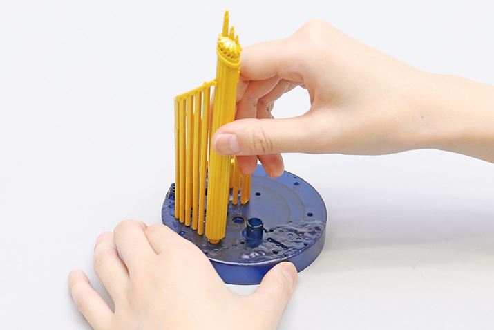 パーツを組み立てて、ベースに差しこみます。プラモデルというより、組み立ての感覚としてはパズルに近いかもしれません。接着剤を使わずに組み立てられます