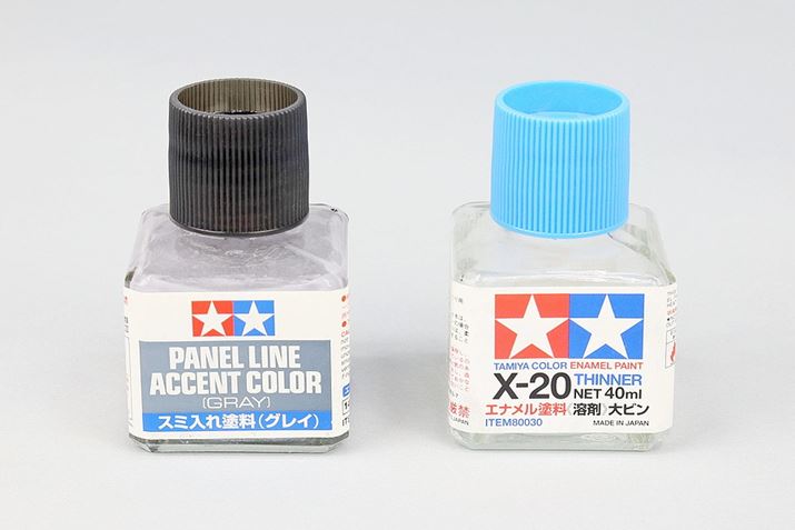 (左)タミヤスミ入れ塗料(グレイ)、(右)タミヤエナメル溶剤。今回は模型用のスミ入れ塗料と、ふき取り用のエナメル溶剤を使用します。ブラックを使用するとメリハリがつきすぎてしまうので、グレー系の色を使うとよいでしょう