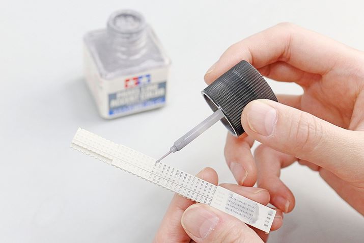 スミ入れ専用塗料をパーツに流し込みます。筆先をミゾにあてると毛細管現象でスッと流れていきます。はみ出した部分はあとで修正できるので、この段階では気にしなくてOK