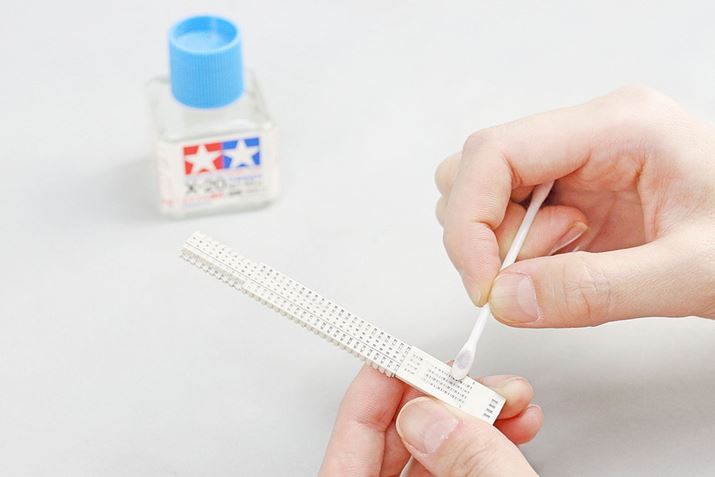 はみ出してしまった部分は、乾燥後にエナメル溶剤を含ませた綿棒でふき取ります。全体にスミ入れをしたら、シールを貼ってできあがりです