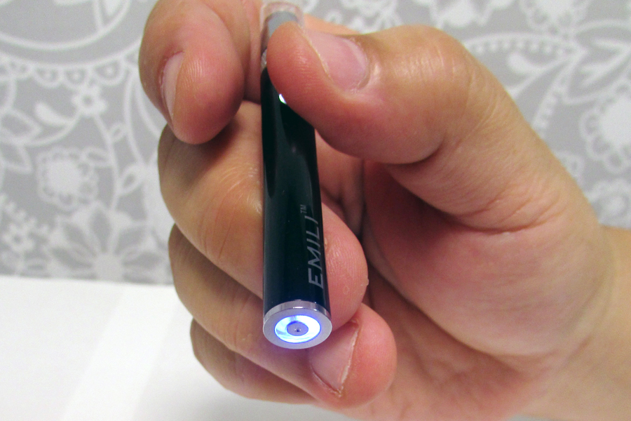 吸う時は、ボタンを押しながら吸い込む。吸い込んだらボタンから手を離す。そのまま吐くと、はたから見ると喫煙以外何物でもない光景だが、ニコチンが入っていないので、嫌なニオイはない。むしろアロマポットを炊いた時のような甘さを感じるいい匂いだ。