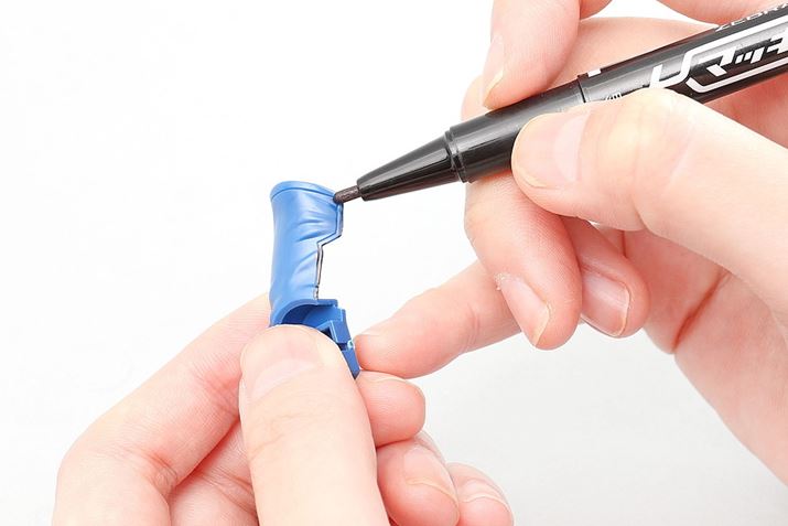ちょっとひと手間。黒い油性マーカーを使って、「キラ・ヤマト」の肩とボディ部分の黒いラインを塗り分けてみましょう。はみ出しはツマヨウジでカリカリと削れば修正できます