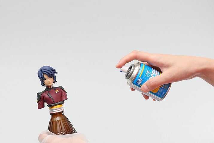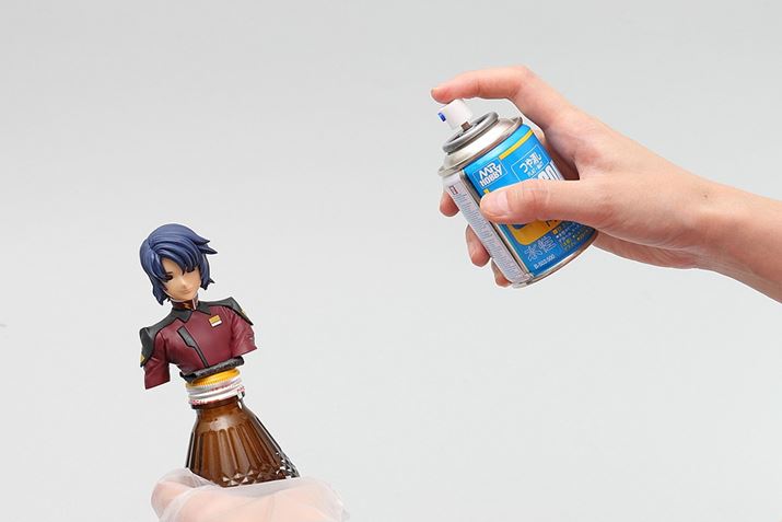 「フィギュアライズバスト」は、顔、髪パーツにつや消し、服パーツに半光沢、瞳パーツに光沢とそれぞれ異なる成形色になっています。そのままでも十分よいのですが、今回はさらにつや消し仕上げにしたいと思います。瞳のパーツ以外に、つや消しスプレーを吹きつけます。なお、つや消しスプレーを使用するときは、換気に注意しましょう。