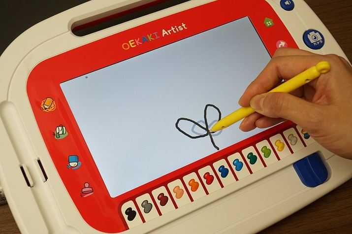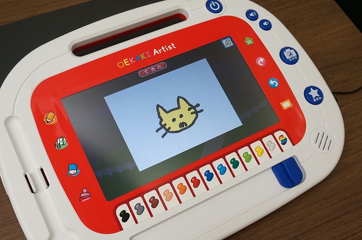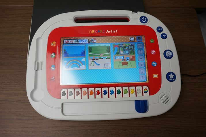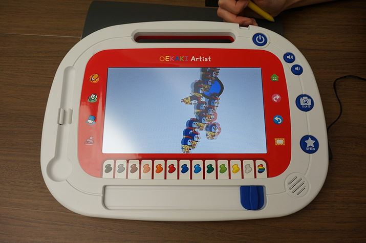「おえかきアーティスト」は、本体はすべてが画面になっているのではなくて、実際に指で押せるボタンが周囲に常備されています。背面には、カメラも搭載されています