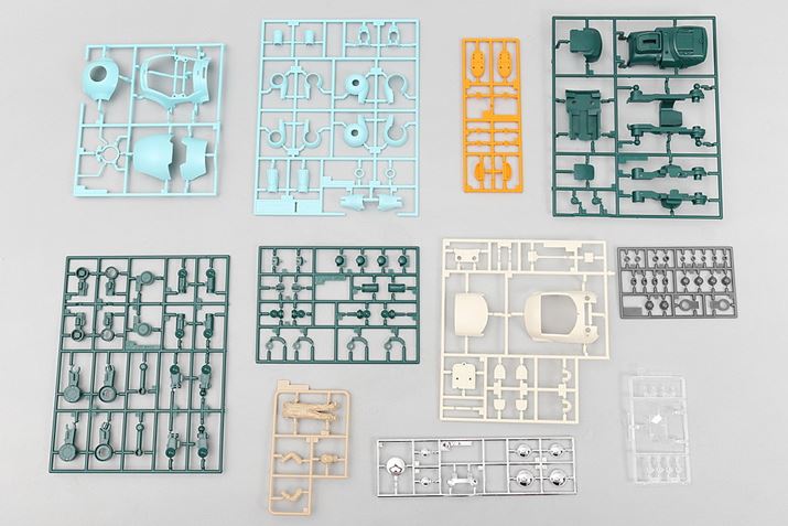 “うすみどり”の箱の中身です。パーツは5色+クリアー。完成したメカトロウィーゴに搭乗させられる、同スケールの男の子フィギュアが付属しています