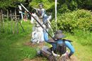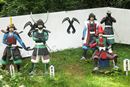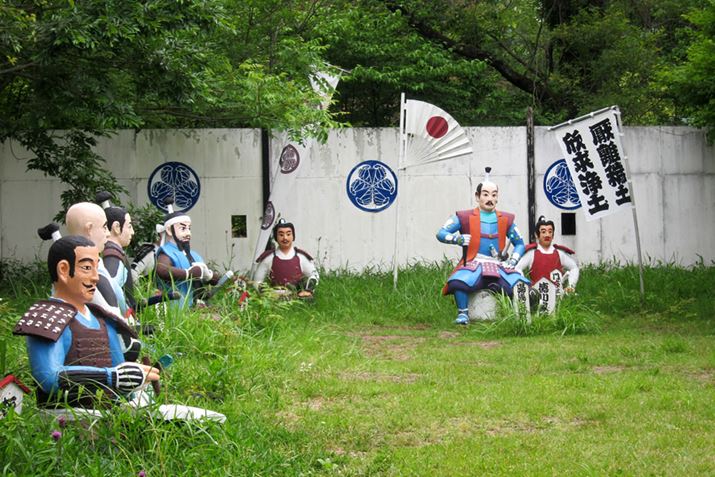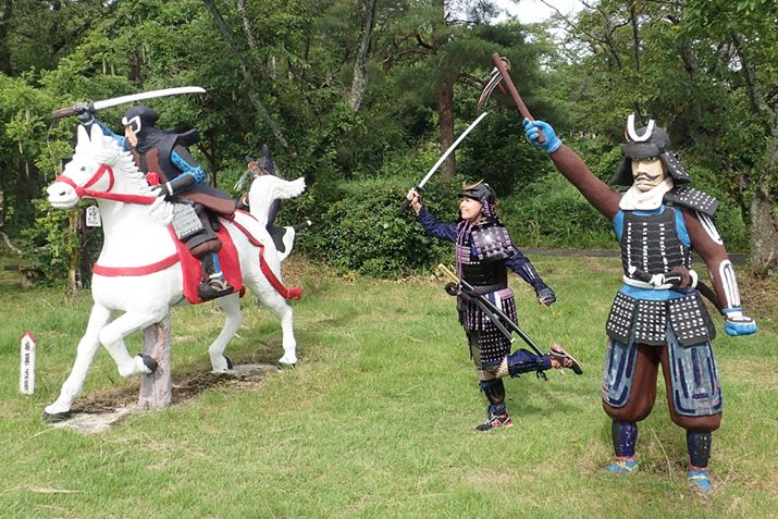 鎧や兜などの展示物も気になるが、筆者のココロはコンクリート像のことでいっぱい。なぜなら、像をただ眺めるだけでなく、触れあったり、ものによっては乗ることもできるのだ。これだけでもテンションが高まるが、なんと甲冑を着て屋外展示場を回ることも可能(料金:大人2,000円、中学生未満の小人1,000円)。さっそく、甲冑を付けて“合戦”へ、いざ出陣!