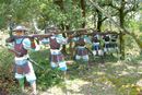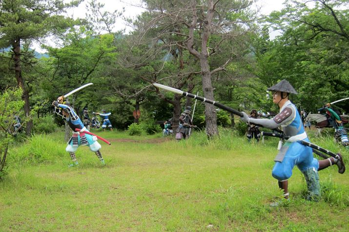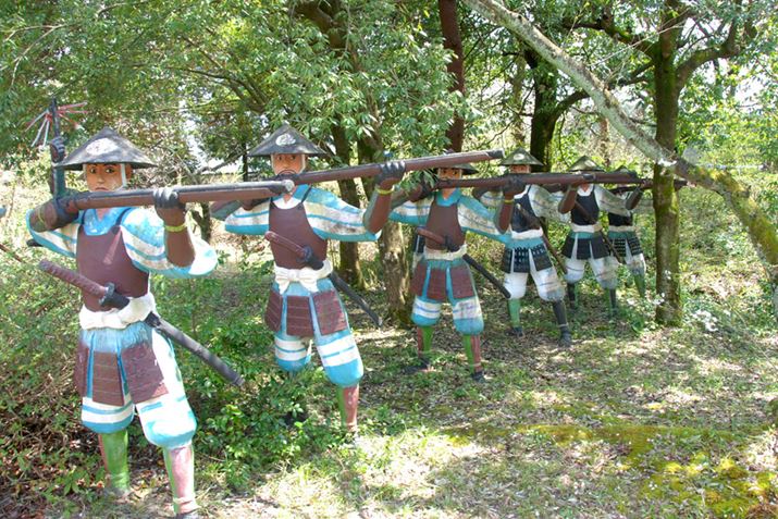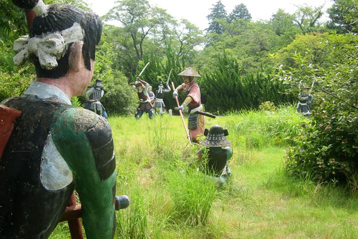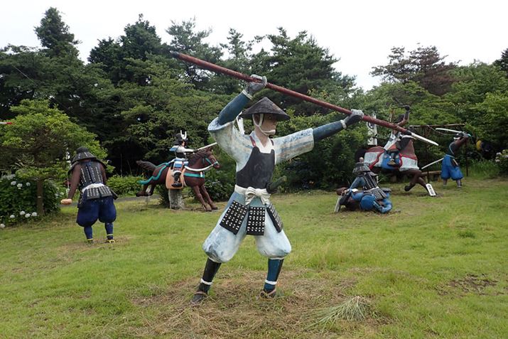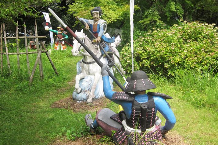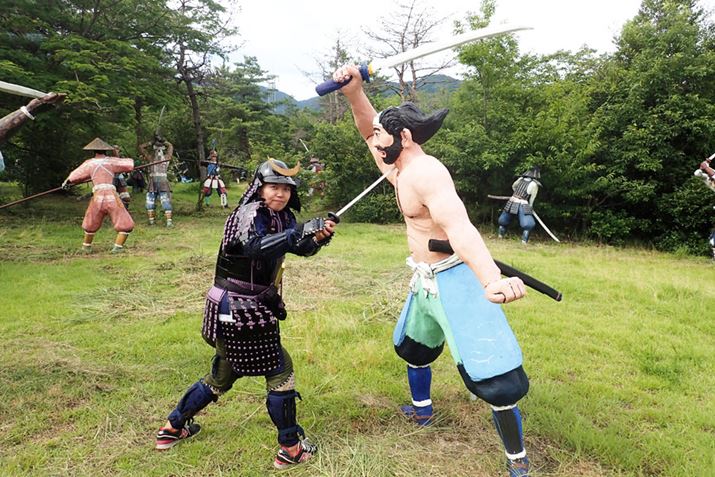 そして、いよいよコンクリート像との対面へ。ガチャガチャと甲冑の音を鳴らしながら進んでいくだけでも合戦気分がどんどん高まるので、絶対レンタル着用はしたほうがいいだろう。さて、コンクリート像と聞くとB級感が漂うが、かなり芸術性が高いものだったりする。実は、園内にある像は幻の造形作家・浅野祥雲が作ったもの。浅野祥雲が手がけた作品が展示されている場所は全国に10か所あるが、浅野祥雲マニアの中で関ケ原ウォーランドはトップ3と言われているそう。テレビ番組「タモリ倶楽部」の浅野祥雲特集で関ケ原ウォーランドが取りあげられたこともあり、歴史ファンのみならず番組のファンや浅野祥雲の遺作を求める人など幅広い層が訪れている。そんなコンクリート像で再現された合戦の地の雰囲気を、まずは見てみて!