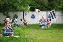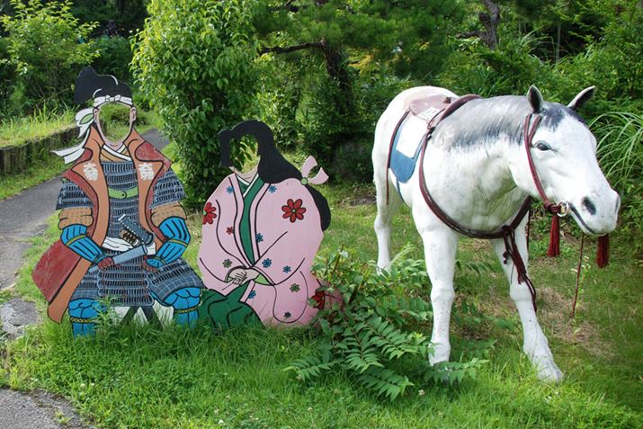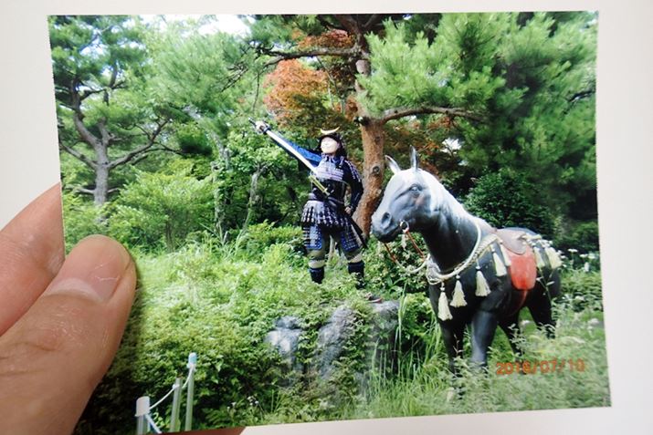 ちなみに、甲冑の着付けが終わると馬のコンクリート像の前で記念撮影をしてもらえ、プリントアウトしたものをいただける