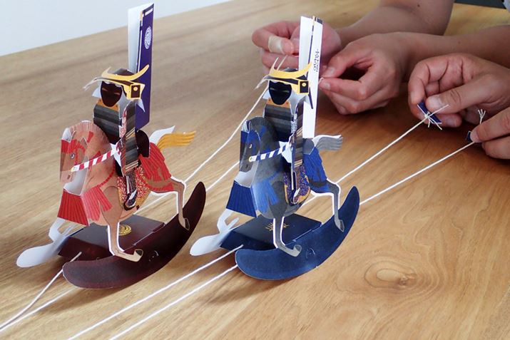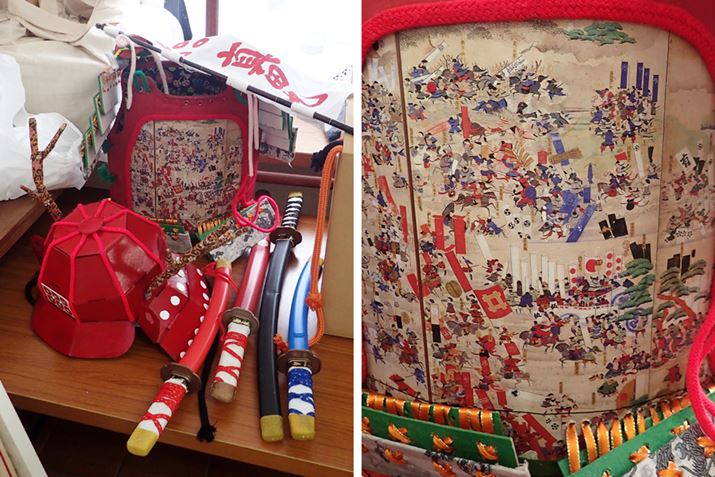 甲冑は重量があるので、子どもが着用できるようにダンボール製の甲冑も用意されている。ダンボール製と言っても、クオリティが高い! 鎧には関ヶ原の戦い絵巻の柄があり、とてもお洒落だ