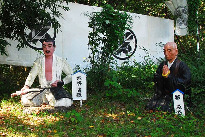 東と西に分かれ、戦いが繰り広げられている。指揮する武将や勇敢に向かっていく兵、切腹する者がいたりと、まさに合戦場! 関ヶ原の戦い当時の陣形どおりにコンクリート像が配置されており、合戦の開始から終了後の東軍による首実検までを再現した、まさに「関ヶ原合戦のダイジェスト版」と言える。名のある武将の像には名前を記した札があるので、ぜひ、あれこれと物語を想像してみてほしい。