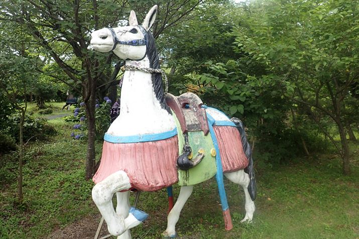 脚立が設置されている馬は、乗ってもOKなもの。武将気分でまたがってみよう!