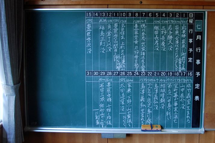 予定を記入する黒板には、7月にあった関ケ原の歴史事件が手書きされていた。7月は9月15日の関ヶ原合戦に向けての攻防があったので予定が目白押しだ