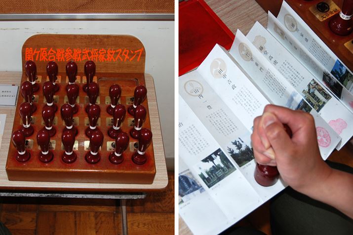 関ヶ原の戦いに参戦した武将の家紋スタンプも、いい味を出している。22武将の家紋をすべて押して持ち帰れば、いい記念になるだろう。ちなみに筆者が押しているスタンプ帳は、関ケ原笹尾山交流館と後述の関ケ原駅前観光交流館で販売されている(価格100円)