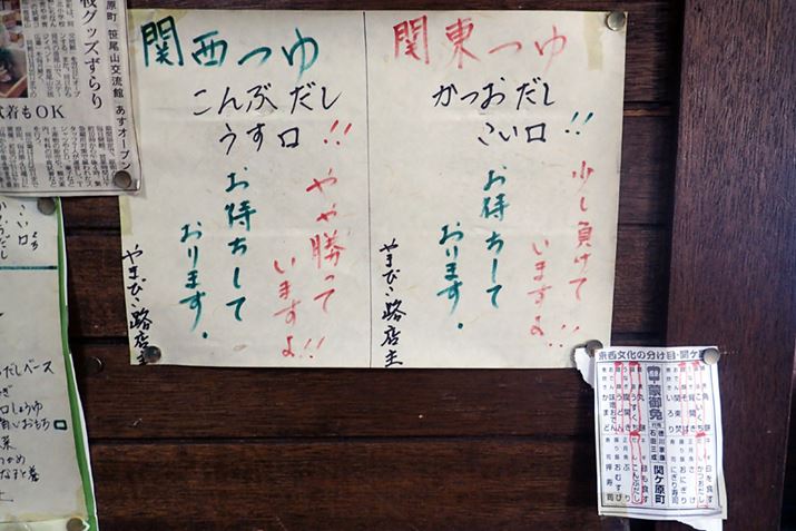 店内の貼紙を見ると、どうやら西(関西風)が優勢のようだ。なんでも、石田三成がこの地で戦争をすることになったから逃げるようにと事前に農民たちに伝えており、民衆を守った経緯があることから関ケ原では西軍びいきが多いという